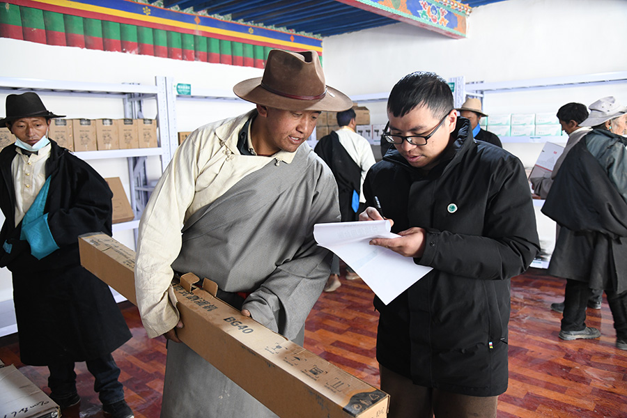 日喀則市昂仁縣多白鄉(xiāng)多白村村民在國家電網(wǎng)在藏首個“電力愛心超市”用積分兌換物品(3月30日攝)。國網(wǎng)西藏電力供圖 索娜央金 攝
