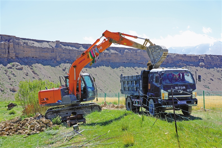 普蘭縣普蘭鎮(zhèn)仁貢村孔雀施工隊的機械車輛在施工,當?shù)厝罕娫谄仗m縣普蘭鎮(zhèn)施工隊務工,一天可增收230元。記者 溫凱 攝