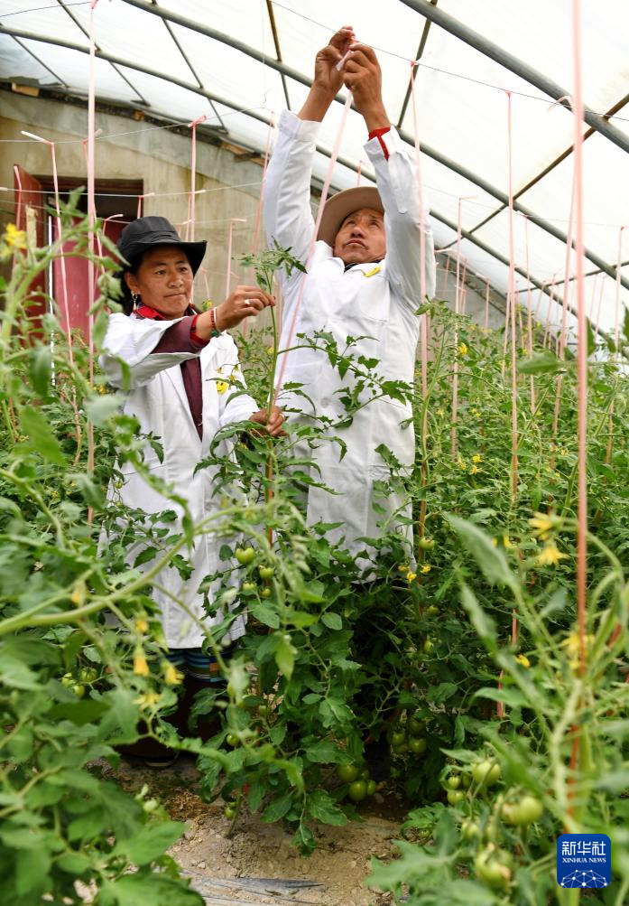 措勤縣高原生態(tài)畜牧業(yè)現(xiàn)代化養(yǎng)殖一體化產(chǎn)業(yè)綜合基地合作社社員在蔬菜大棚為西紅柿吊蔓(8月19日攝)。新華社記者 張汝鋒 攝