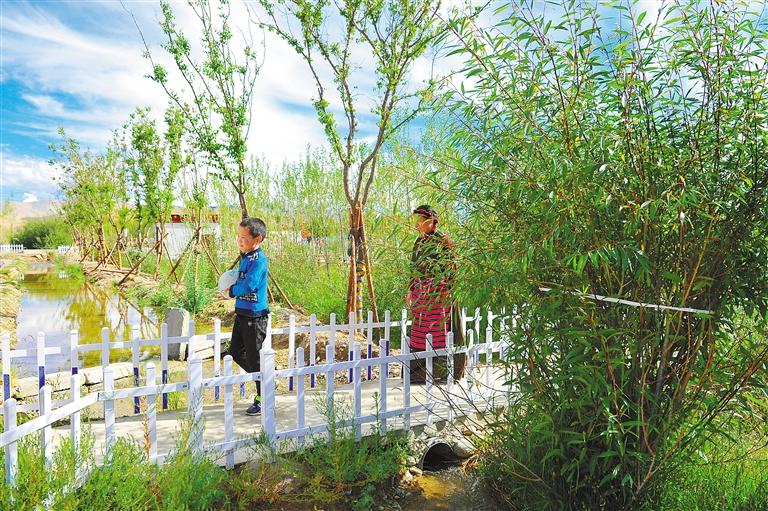 圖為阿里地區(qū)噶爾縣加木村群眾走在綠樹成蔭的小道上。 記者 溫凱 攝