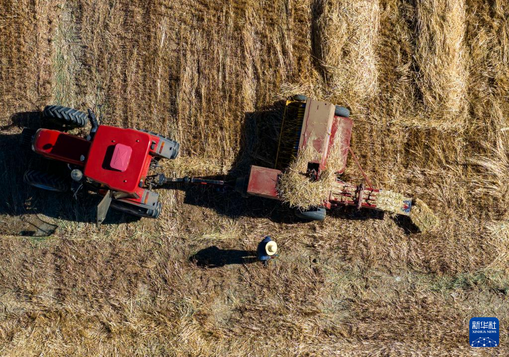 10月24日,村民駕駛農(nóng)機在拉薩市林周縣強嘎鄉(xiāng)曲嘎強村將收割過的牧草打包(無人機照片)。新華社記者 姜帆 攝