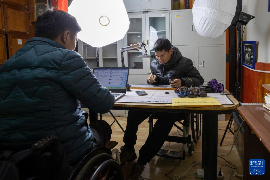 西藏拓崗文化傳播有限公司主播次旦貢嘎(右)與直播助理扎西旺堆在合作直播銷售藏語(yǔ)學(xué)習(xí)文具(11月10日攝)。新華社記者 姜帆 攝