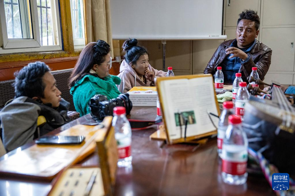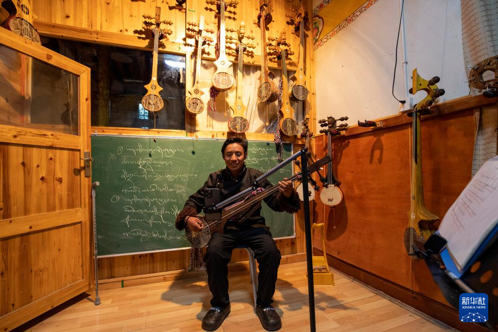 西藏拓崗文化傳播有限公司主播邊桑在直播銷售西藏傳統(tǒng)樂器扎念琴(11月10日攝)。新華社記者 姜帆 攝