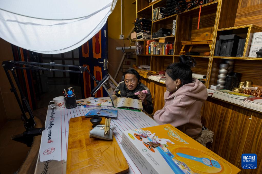 西藏拓崗文化傳播有限公司員工拉巴頓珠(左)與主播索朗德吉合作直播銷售藏語(yǔ)學(xué)習(xí)文具(11月10日攝)。新華社記者 姜帆 攝