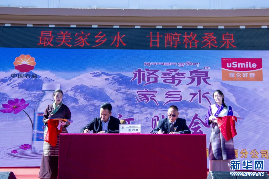 11月15日,“家鄉(xiāng)水·格桑泉”訂購會現(xiàn)場合作單位雙方進(jìn)行簽約。新華網(wǎng) 旦增努布 攝