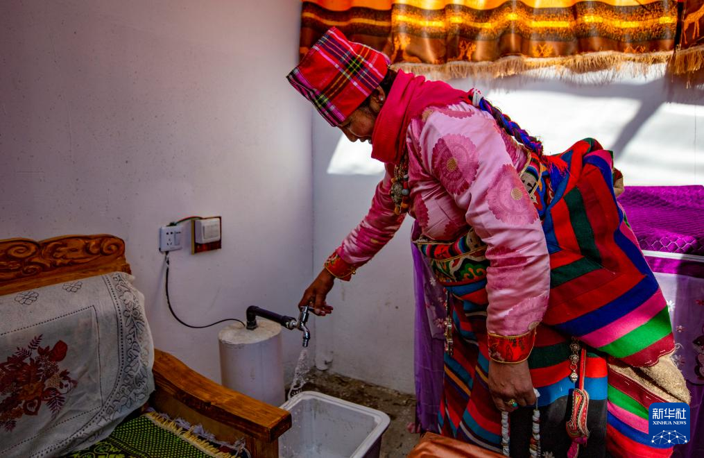 今年51歲的戶主格桑松塔說(shuō),以前冬天用水要去幾公里外的湖上鑿冰,后來(lái)要去幾百米外的機(jī)電井水房背水,自從2023年11月搬入新居,足不出戶就能用上水。他身旁,連接上水管的洗衣機(jī)正發(fā)出工作的轟隆聲。