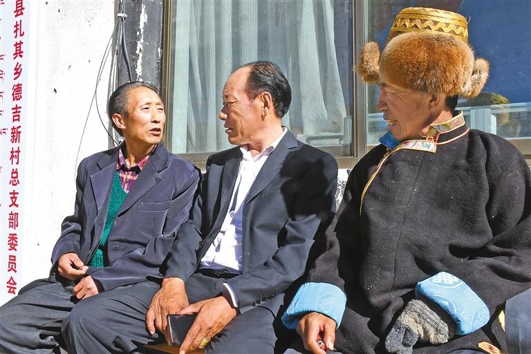 扎囊縣扎其鄉(xiāng)德吉新村,生活著藏族、漢族、土族等不同民族790余名群眾,該村先后榮獲縣級(jí)民族團(tuán)結(jié)進(jìn)步模范集體、山南市民族團(tuán)結(jié)進(jìn)步模范單位、自治區(qū)民族團(tuán)結(jié)進(jìn)步模范村(居)等稱號(hào),是山南市遠(yuǎn)近聞名的“團(tuán)結(jié)村”。 圖為在德吉新村村委會(huì)大院內(nèi),祖籍青海,身著藏裝的村民張積成(右一),與同村不同民族的群眾一起交談。 記者 丹增平措 攝