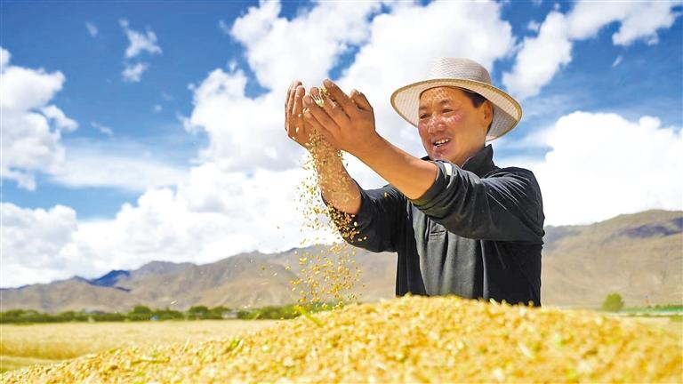 日喀則市白朗縣嘎東鎮(zhèn)馬義村村委會副主任普瓊手捧豐收的麥粒,高興地說:“高標(biāo)準(zhǔn)農(nóng)田建設(shè)為我們節(jié)省了大量的人力,實(shí)現(xiàn)了農(nóng)業(yè)機(jī)械化,讓未來的生活充滿了希望?!?/p>