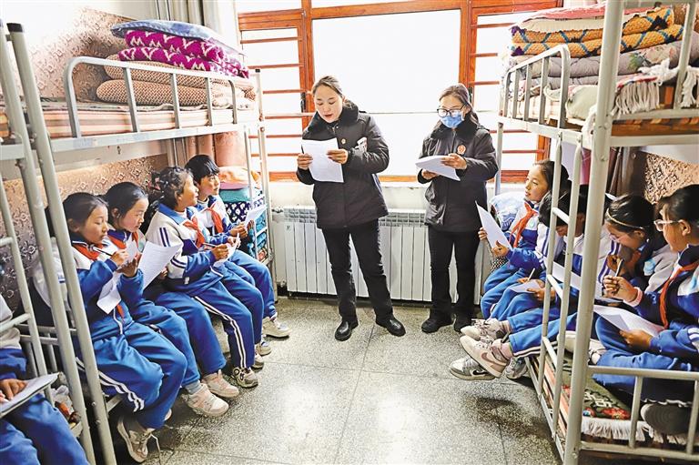 圖為措美縣人民法院工作人員在措美縣小學(xué)學(xué)生宿舍向?qū)W生普及法律知識(shí)。 記者 巴桑旺姆 攝