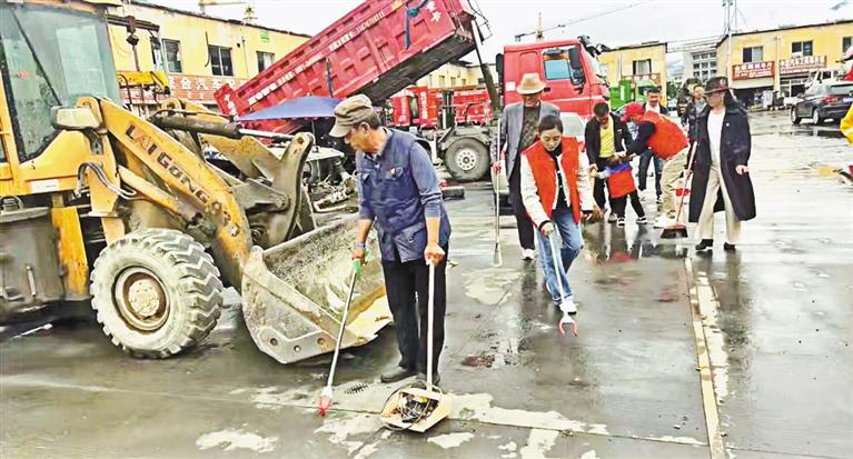 巴宜區(qū)尼池社區(qū)的工作人員身穿紅馬甲,手拿鐵鍬、掃帚等工具對林芝市快修市場附近的垃圾雜物進行清理,“黨建引領(lǐng)聚合力 環(huán)境整治我先行”的標(biāo)語迎風(fēng)飄揚;