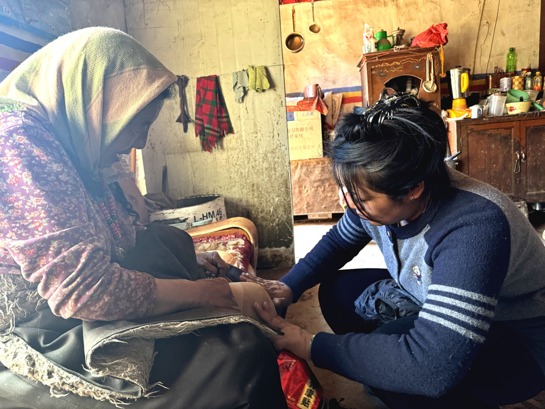 圖為駐村工作隊員德慶巴吉(右一)正在為阿益奶奶貼膏藥貼。