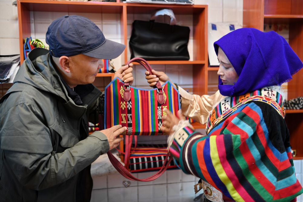 一名來(lái)自上海的游客(左)在安多托尕爾倉(cāng)游牧產(chǎn)業(yè)有限責(zé)任公司展廳挑選產(chǎn)品(8月24日攝)。