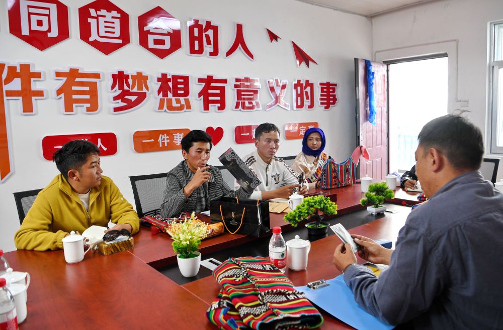 倉(cāng)秋多吉(左二)和團(tuán)隊(duì)核心成員商討產(chǎn)品銷(xiāo)售提升策略(8月24日攝)。
