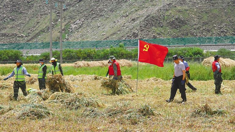 圖為拉薩市堆龍德慶區(qū)古榮護(hù)路大隊(duì)志愿服務(wù)分隊(duì)深入田間地頭,幫助農(nóng)民收割青稞。