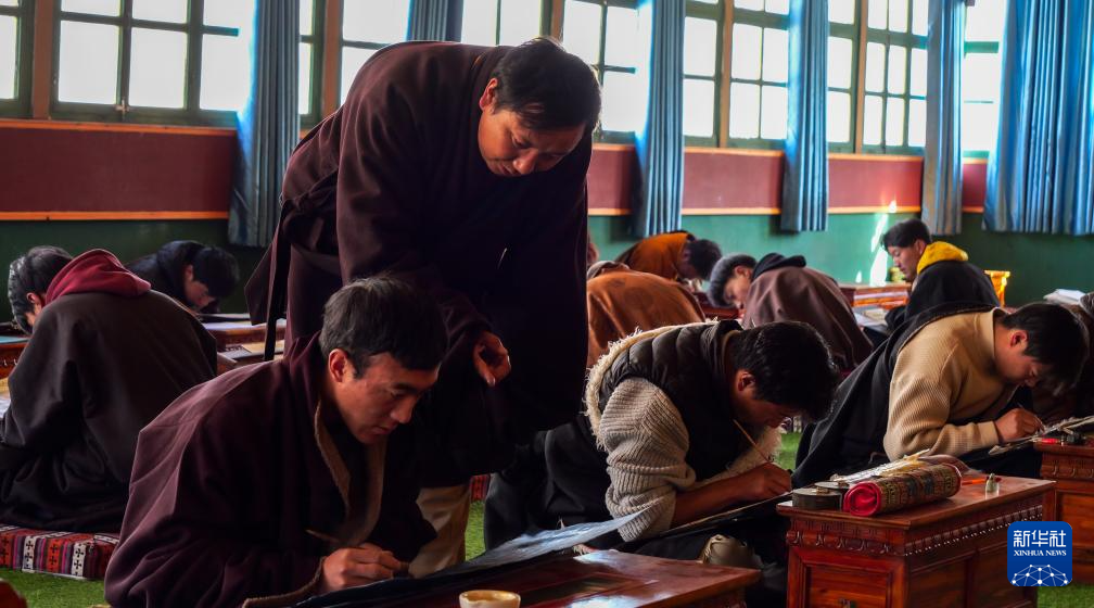 11月22日,昌都市丁青縣擁忠文化藝術(shù)中心非遺扶貧就業(yè)工坊學(xué)員在練習(xí)藏文書法。新華社記者 普布次仁 攝