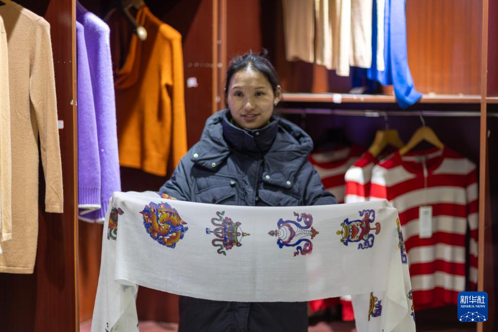 措勤縣的銷售人員在展示用紫山羊絨為原料制作的印有八寶圖案的哈達(11月20日攝)。新華社記者 姜帆 攝