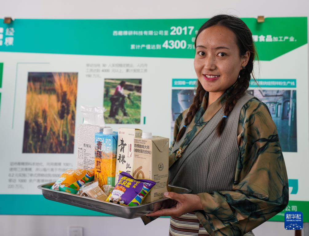 西藏稞研農業(yè)科技有限公司工作人員展示部分青稞產品(10月16日攝)。新華社記者 晉美多吉 攝