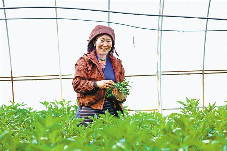 圖為當?shù)厝罕娫诖笈飪?nèi)采摘辣椒。記者 格桑倫珠 攝