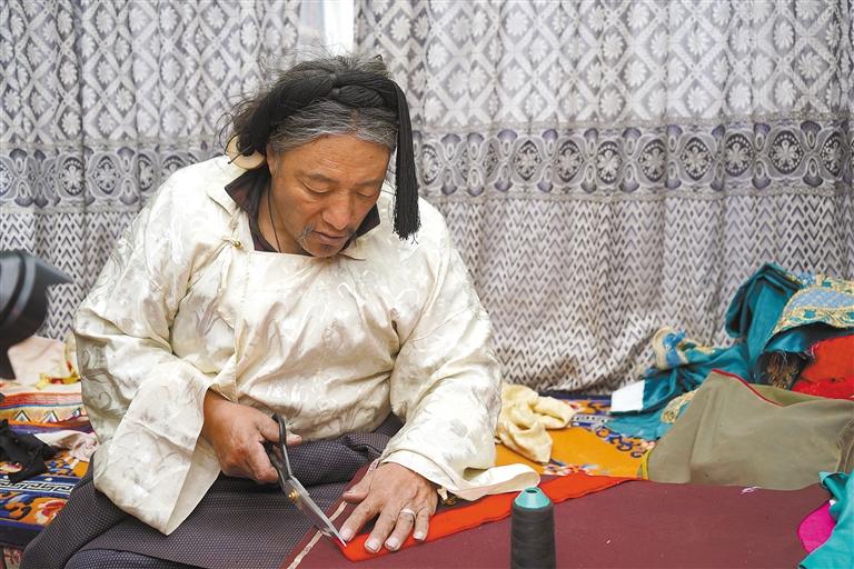 “新衣服老大穿,穿舊了給老二,縫縫補(bǔ)補(bǔ)給老三。”次歐打趣道,“在以前生活相對(duì)拮據(jù)的時(shí)候,有了這門手藝,家里人即使穿著補(bǔ)丁衣服,御寒倒是不用擔(dān)心了。隨著縫紉手藝越來(lái)越精湛,我會(huì)用舊的布料為家人制作合身的藏裝,漸漸地,街坊鄰居也會(huì)上門找我做衣服,自此我也吃上了‘手藝飯’?!?/p>