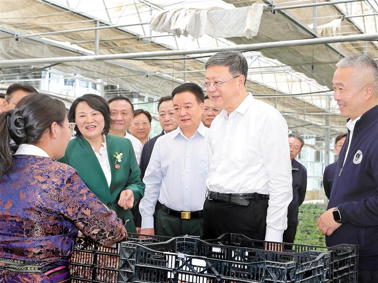 來到薩迦縣國家現(xiàn)代農(nóng)業(yè)產(chǎn)業(yè)園,溫室大棚內(nèi)作物長勢良好,一派生機(jī)盎然。近年來,在自治區(qū)黨委的大力推動下,上海市援藏力量主動作為,助力當(dāng)?shù)卮罅Πl(fā)展高原特色農(nóng)業(yè),不斷拓寬群眾增收渠道。代表團(tuán)走進(jìn)產(chǎn)業(yè)園,聽取高原藜麥種源科技和產(chǎn)業(yè)發(fā)展、藏紅花種植技術(shù)創(chuàng)新和產(chǎn)業(yè)幫扶情況介紹,察看相關(guān)產(chǎn)品展示,與園區(qū)、企業(yè)負(fù)責(zé)人和科研團(tuán)隊(duì)深入交流,就進(jìn)一步推進(jìn)高寒地區(qū)現(xiàn)代農(nóng)業(yè)全產(chǎn)業(yè)鏈高質(zhì)量發(fā)展進(jìn)行討論。兩地同志表示,要立足雙方優(yōu)勢,把上海資金、管理、科技、人才等優(yōu)勢與西藏資源、區(qū)位等優(yōu)勢相結(jié)合,進(jìn)一步做強(qiáng)特色產(chǎn)業(yè)、打響高原品牌,在以銷定產(chǎn)、產(chǎn)品推廣等方面開展深度合作,促進(jìn)西藏優(yōu)質(zhì)資源變成好產(chǎn)品、走向大市場、賣出好價(jià)錢,有效帶動群眾就業(yè)增收,讓各族群眾錢包鼓起來、日子好起來。