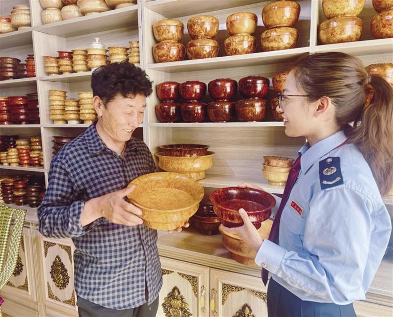 傳承人向稅務工作人員介紹木碗雕刻工藝。 圖由自治區(qū)稅務局提供