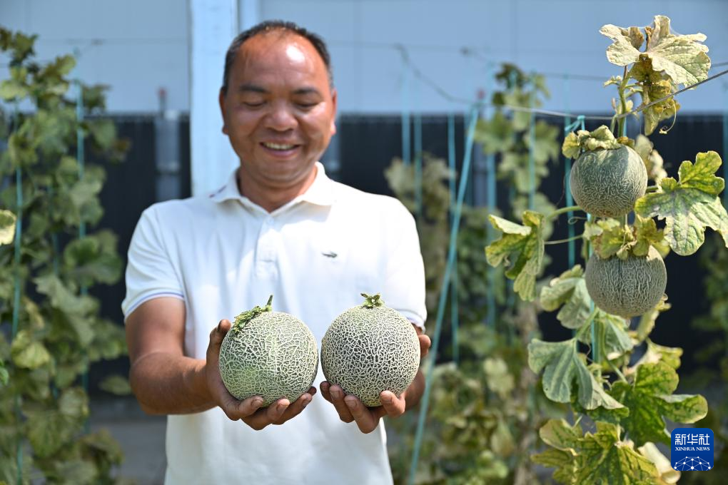 7月19日,西藏扎囊縣綠之源現(xiàn)代農(nóng)業(yè)科技股份有限公司的農(nóng)業(yè)技術(shù)人員李紹忠在大棚內(nèi)展示網(wǎng)紋蜜瓜。新華社記者 李鑫 攝