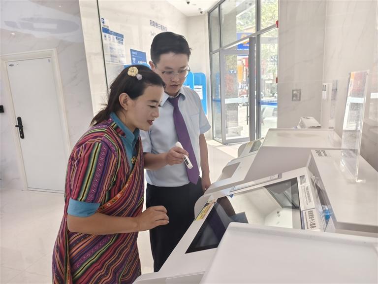 中國建設(shè)銀行墨脫支行開業(yè)當(dāng)天,工作人員成功為當(dāng)?shù)亻T巴族客戶在智慧柜員機上辦理首筆業(yè)務(wù)。