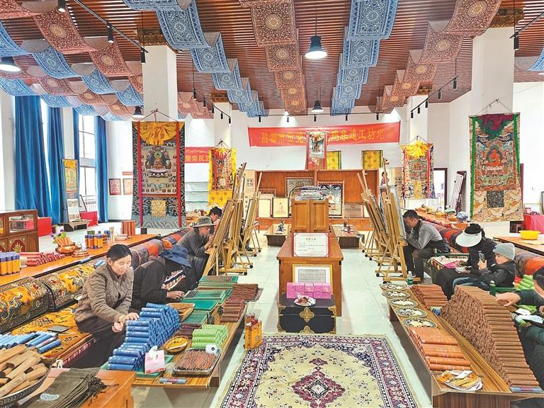 黨建引領(lǐng),產(chǎn)業(yè)提質(zhì)。在當?shù)攸h委、政府的大力扶持下,政策引導、資金注入、平臺搭建等利好舉措相繼落地。短短4年間,貢覺縣桑珠榮村一處不起眼的廠房華麗轉(zhuǎn)身,變?yōu)樯V闃s村民族手工業(yè)孵化基地,堤無瑪藝術(shù)傳承合作社也應運而生,成為該村的集體經(jīng)濟組織。