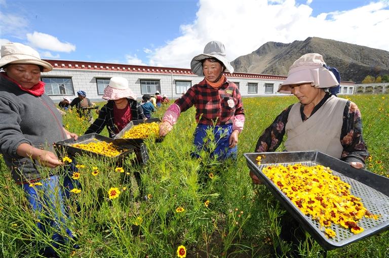 圖為拉薩市曲水縣才納鄉(xiāng)現(xiàn)代農(nóng)業(yè)科技園的工作人員正在采摘雪菊。西藏日報記者 白瑪澤旺 攝