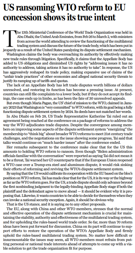 原標(biāo)題:US ransoming WTO reform to EU concession shows its true intent