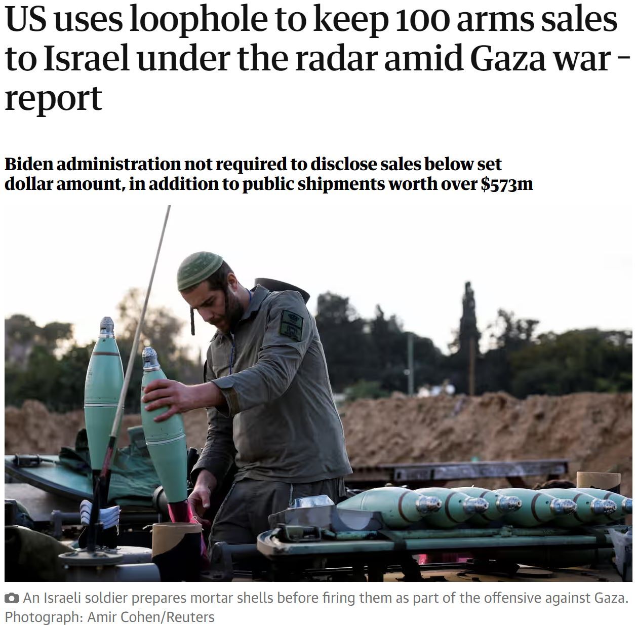 而據(jù)美國(guó)現(xiàn)任和前任官員此前披露,本輪巴以沖突爆發(fā)后,拜登政府已秘密通過100多筆單獨(dú)軍售計(jì)劃,向以色列輸送了大量武器。