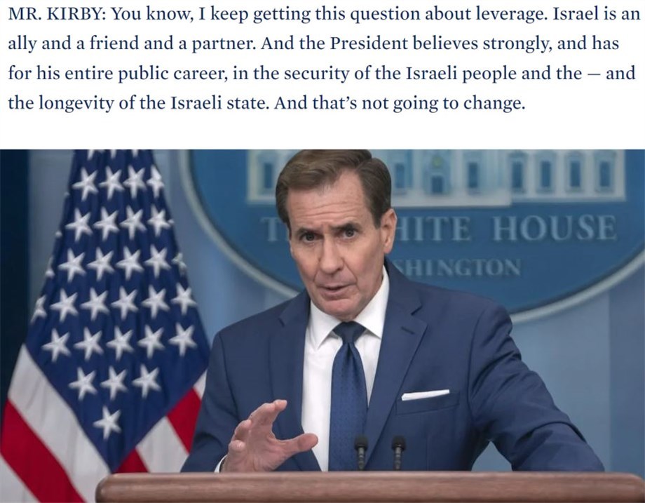 白宮國(guó)家安全委員會(huì)戰(zhàn)略溝通協(xié)調(diào)員柯比當(dāng)天在記者會(huì)上被反復(fù)追問“美國(guó)是否會(huì)切斷對(duì)以色列的武器供應(yīng)”時(shí)一味回避躲閃,但在回答美以關(guān)系問題時(shí)卻斬釘截鐵。