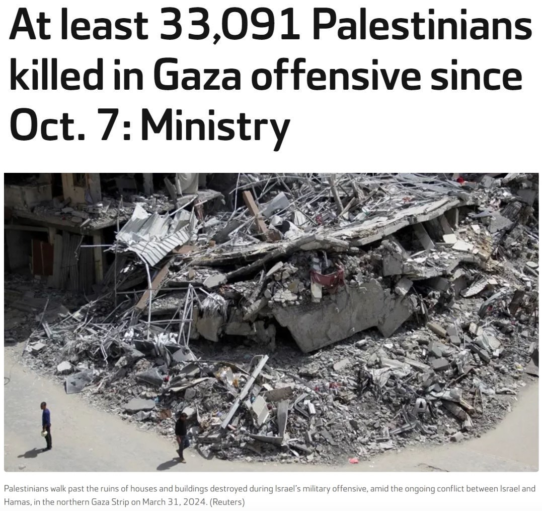 根據(jù)加沙衛(wèi)生部門當(dāng)?shù)貢r(shí)間5日提供的數(shù)據(jù),以色列在加沙地帶的軍事行動(dòng)已導(dǎo)致超過3.3萬人死亡,超過7.5萬人受傷,其中大部分是巴勒斯坦婦女和兒童。