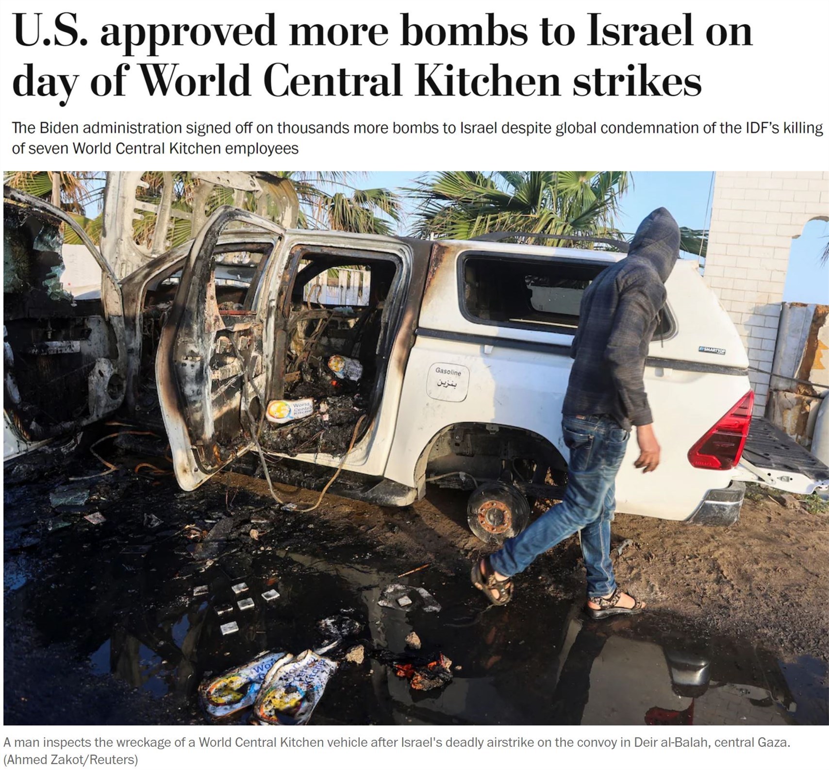 據(jù)美媒報(bào)道,就在以軍襲擊國(guó)際慈善組織的同一天,美國(guó)批準(zhǔn)再向以色列提供數(shù)千枚炸彈。