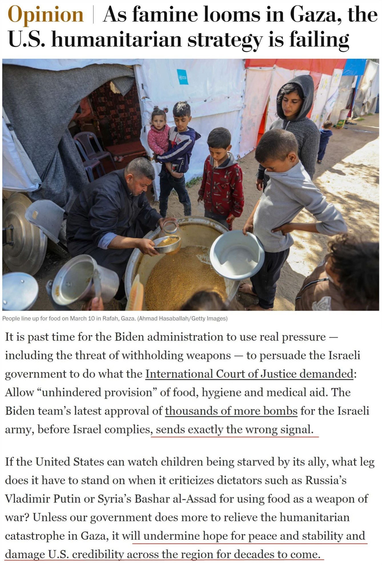 文章認(rèn)為,拜登政府早就應(yīng)該利用真正的壓力——包括威脅中斷武器供應(yīng)——來迫使以色列政府允許外界向加沙“不受阻礙地提供”食品和醫(yī)療援助。但相反,拜登團(tuán)隊(duì)最近卻批準(zhǔn)再向以軍提供數(shù)千枚炸彈,“這發(fā)出了完全錯(cuò)誤的信號(hào)”。