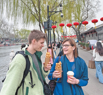 4月初,利用免簽政策赴華旅游的比利時游客在北京后海品嘗小吃。梵尚·沃姆攝