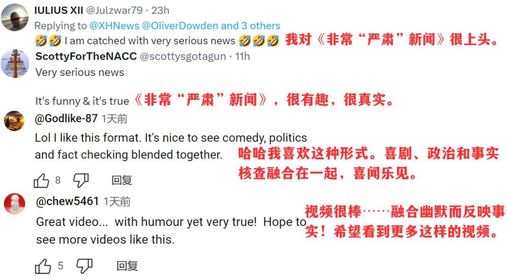 脫口秀播發(fā)后,英國(guó)議會(huì)議員喬治·加洛韋、倫敦廣播公司主持人丹尼絲·黑德利、倫敦都市大學(xué)副教授康斯坦丁諾斯·皮塔基、美國(guó)反戰(zhàn)組織“粉色代碼”等機(jī)構(gòu)和個(gè)人賬號(hào)紛紛轉(zhuǎn)贊評(píng)。網(wǎng)友們?cè)谠u(píng)論區(qū)呼吁:這樣有趣又有料的節(jié)目,多多益善!