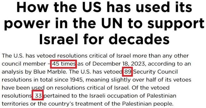 根據(jù)美國智庫"芝加哥全球事務(wù)委員會"的統(tǒng)計,截至2023年12月18日,美國否決批評以色列的安理會決議的次數(shù)比任何其他安理會成員國都多,為45次。自1945年以來,美國總共否決了89項安理會決議,這意味著,超半數(shù)的否決權(quán)被用于批評以色列的決議。而在被否決的決議中,有33項涉及以色列對巴勒斯坦領(lǐng)土的占領(lǐng)或巴勒斯坦人的待遇問題。