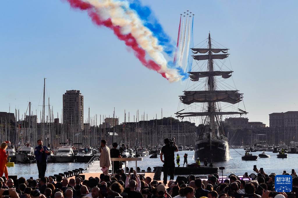 ??傍晚時(shí)分,伴隨著現(xiàn)場觀眾高唱法國國歌《馬賽曲》,“貝勒姆”號(hào)緩緩駛進(jìn)港口,著名的“法蘭西巡邏兵”飛行表演隊(duì)從港口上空呼嘯而過,先后展示了奧運(yùn)五環(huán)與法國國旗的圖案。