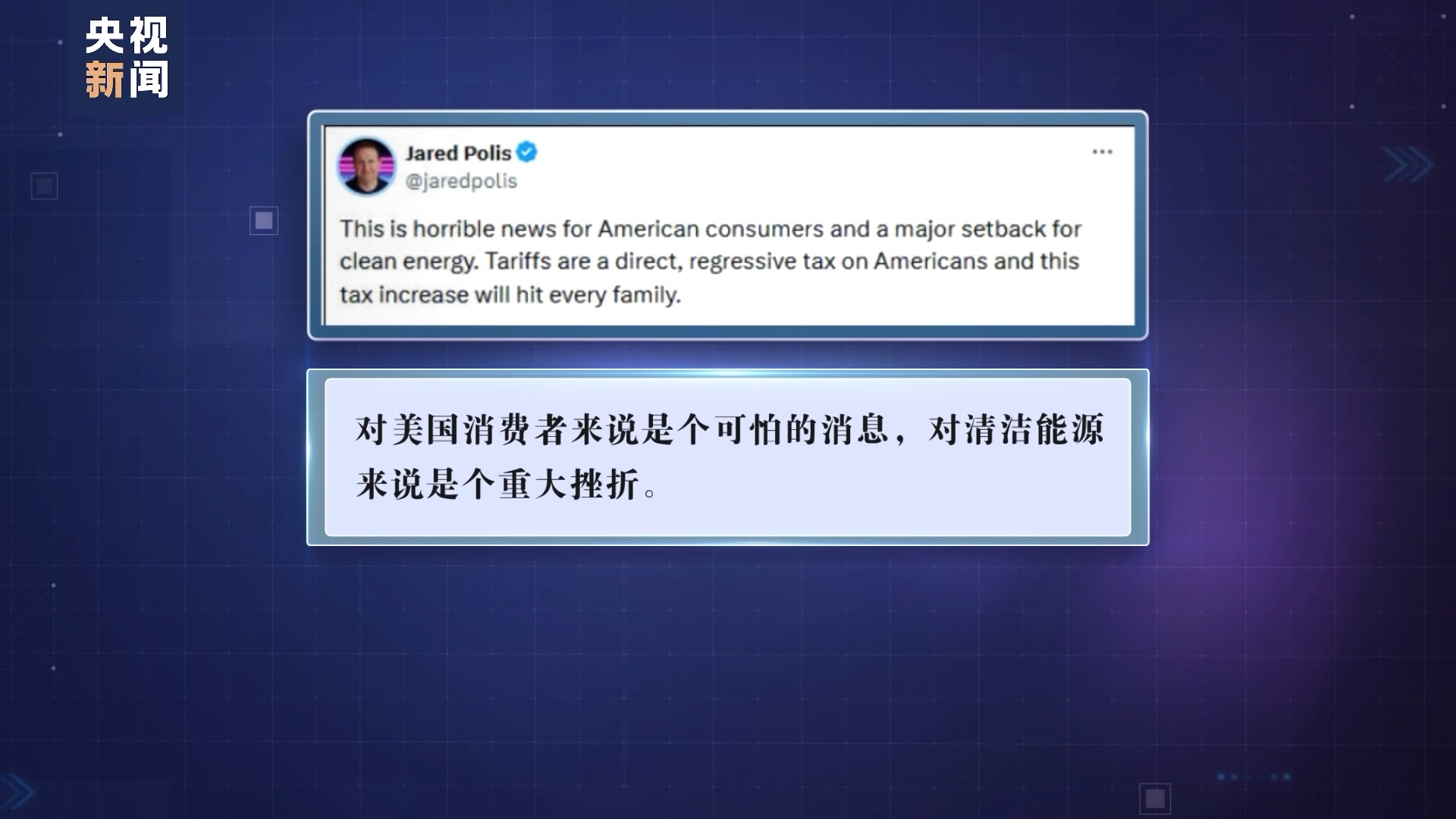 科羅拉多州民主黨籍州長(zhǎng)賈里德·波利斯也在社交媒體平臺(tái)發(fā)帖寫(xiě)道,此舉“對(duì)美國(guó)消費(fèi)者來(lái)說(shuō)是個(gè)可怕的消息,對(duì)清潔能源來(lái)說(shuō)是個(gè)重大挫折”。
