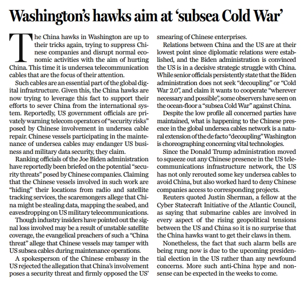 海底光纜是全球數(shù)字基礎(chǔ)設(shè)施的基礎(chǔ)組成部分。對(duì)華鷹派們正利用這一點(diǎn)大做文章,為自己試圖把中國(guó)從全球體系中分離的行徑找理由。據(jù)報(bào)美國(guó)政府一些官員已私下向電信運(yùn)營(yíng)商們發(fā)出警告,稱讓中國(guó)參與海底光纜維修可能會(huì)引發(fā)“安全風(fēng)險(xiǎn)”,并稱參與海底光纜維護(hù)的中國(guó)船只可能“危及美國(guó)商業(yè)和軍事數(shù)據(jù)安全”。
