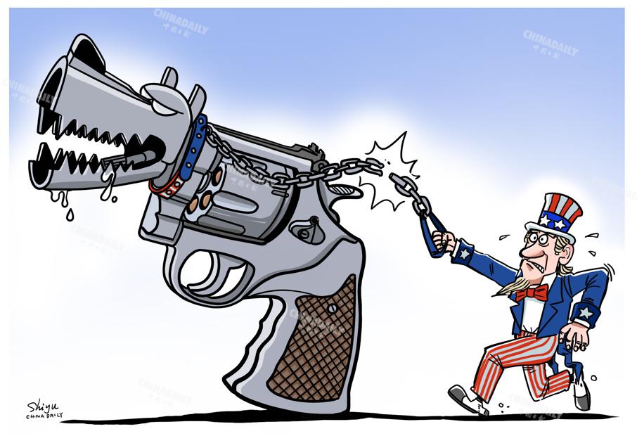 美國(guó)槍支如同“惡犬”,脫離掌控害人害己。(作者:中國(guó)日?qǐng)?bào) 石宇)
