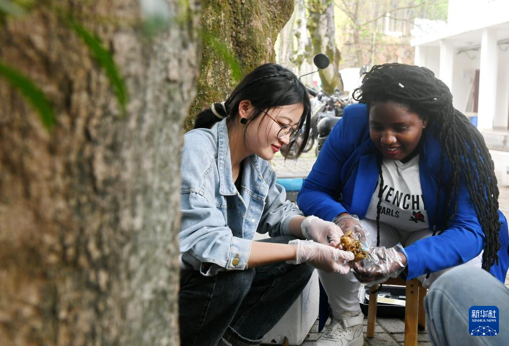 2024年3月28日,在位于福州的福建農(nóng)林大學(xué),來自盧旺達(dá)的梅迪在國家菌草工程技術(shù)研究中心向中國學(xué)生嘉欣瑤了解“綠洲3號(hào)”菌草品種。新華社記者 林善傳 攝