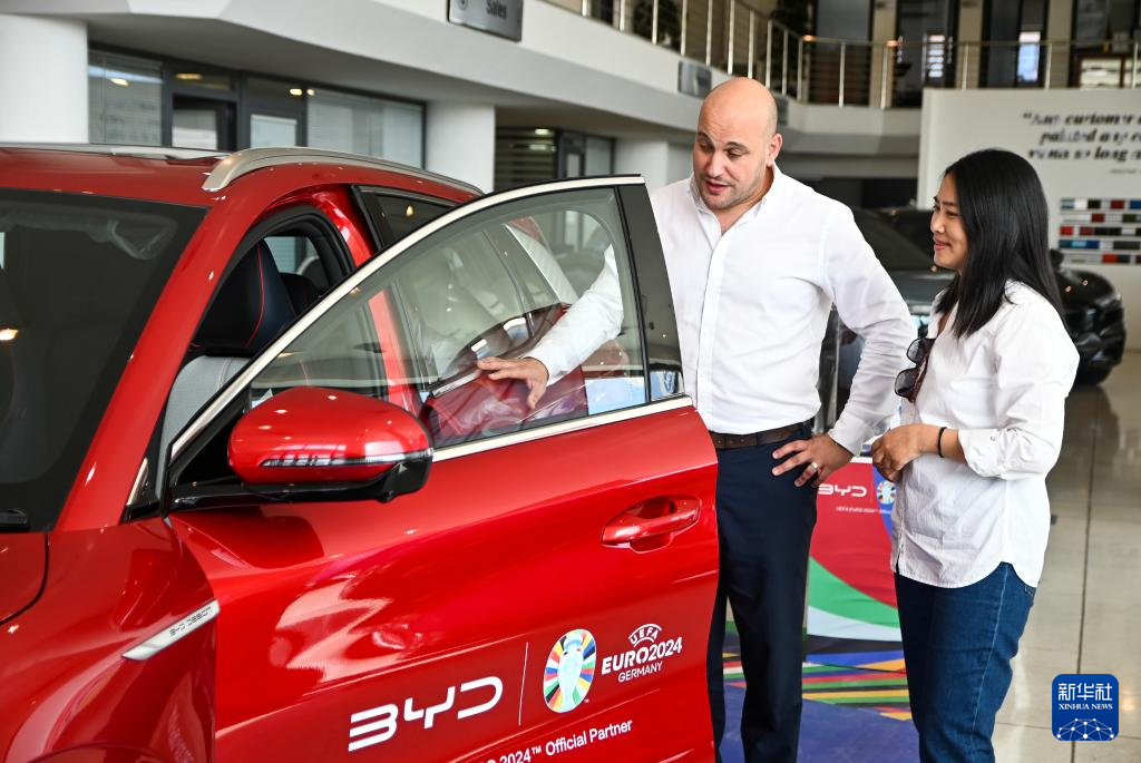 2024年5月29日,在馬耳他比爾基卡拉,馬耳他哈桑-扎米特汽車公司首席執(zhí)行官德古阿拉(左)介紹一輛比亞迪純電動汽車。新華社發(fā)(喬納森·博格 攝)
