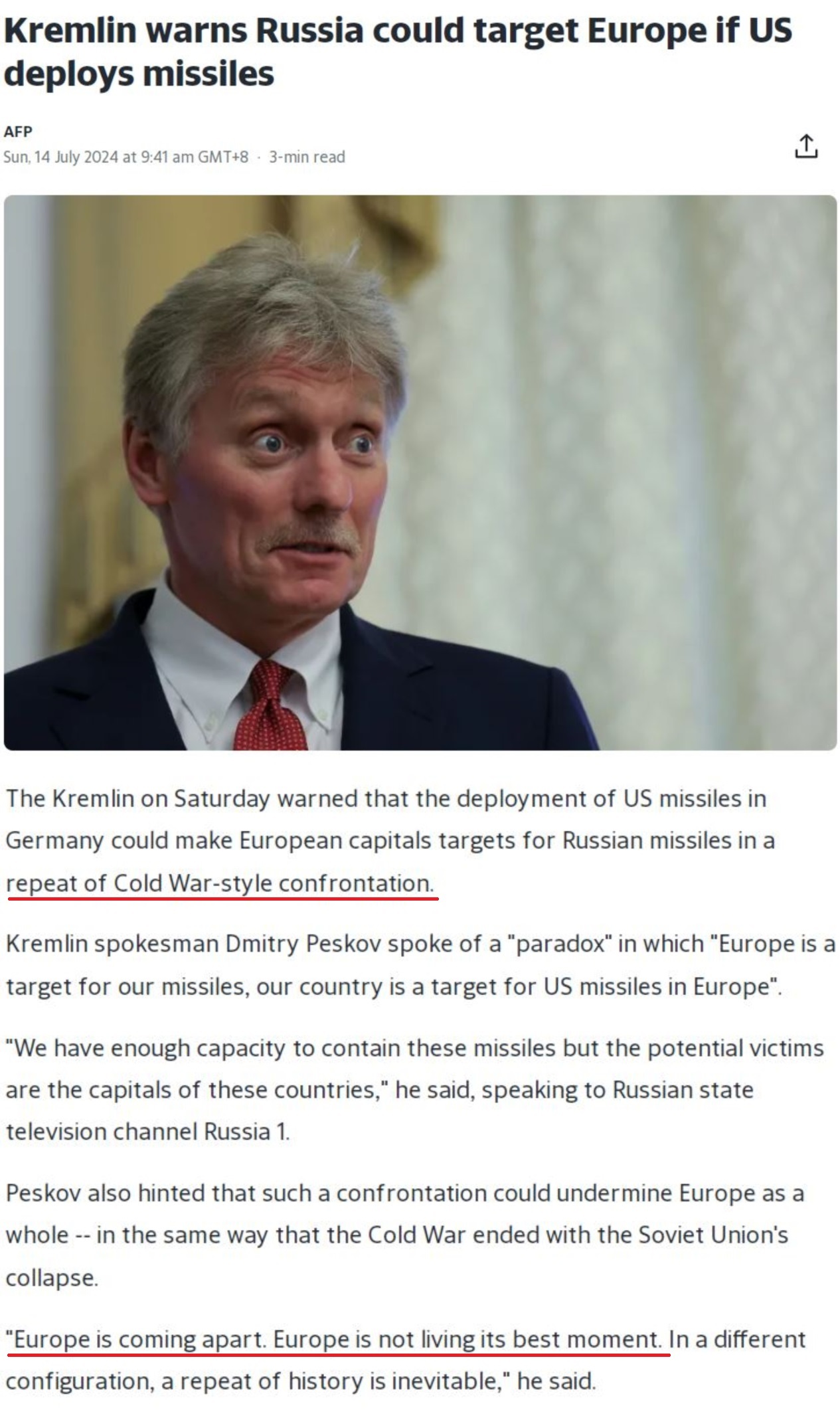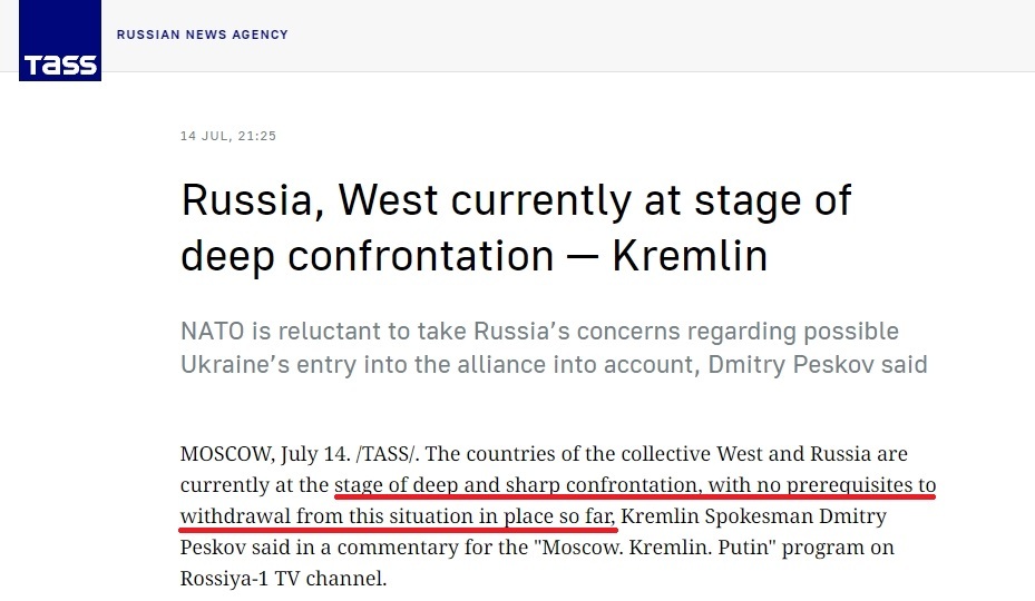 佩斯科夫警告,美國(guó)的最新舉動(dòng)可能會(huì)讓歐洲“重演冷戰(zhàn)式對(duì)抗”,“歐洲正在分崩離析。對(duì)歐洲來(lái)說,這絕不是最好的時(shí)刻”。