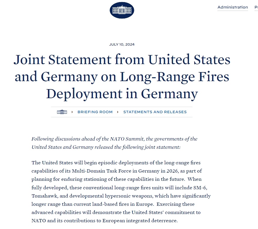 在上周的北約華盛頓峰會(huì)期間,美國(guó)和德國(guó)聯(lián)合宣布,作為長(zhǎng)期規(guī)劃的一部分,美國(guó)將從2026年開始分階段在德國(guó)部署遠(yuǎn)程武器。