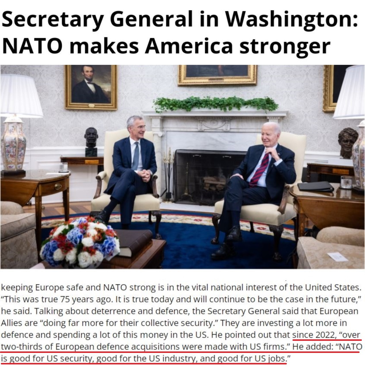 北約官網(wǎng):斯托爾滕貝格告訴美國(guó)總統(tǒng)拜登,保持歐洲安全和北約強(qiáng)大符合美國(guó)的國(guó)家利益,“有利于美國(guó)的安全,有利于美國(guó)的工業(yè),有利于美國(guó)的就業(yè)”。