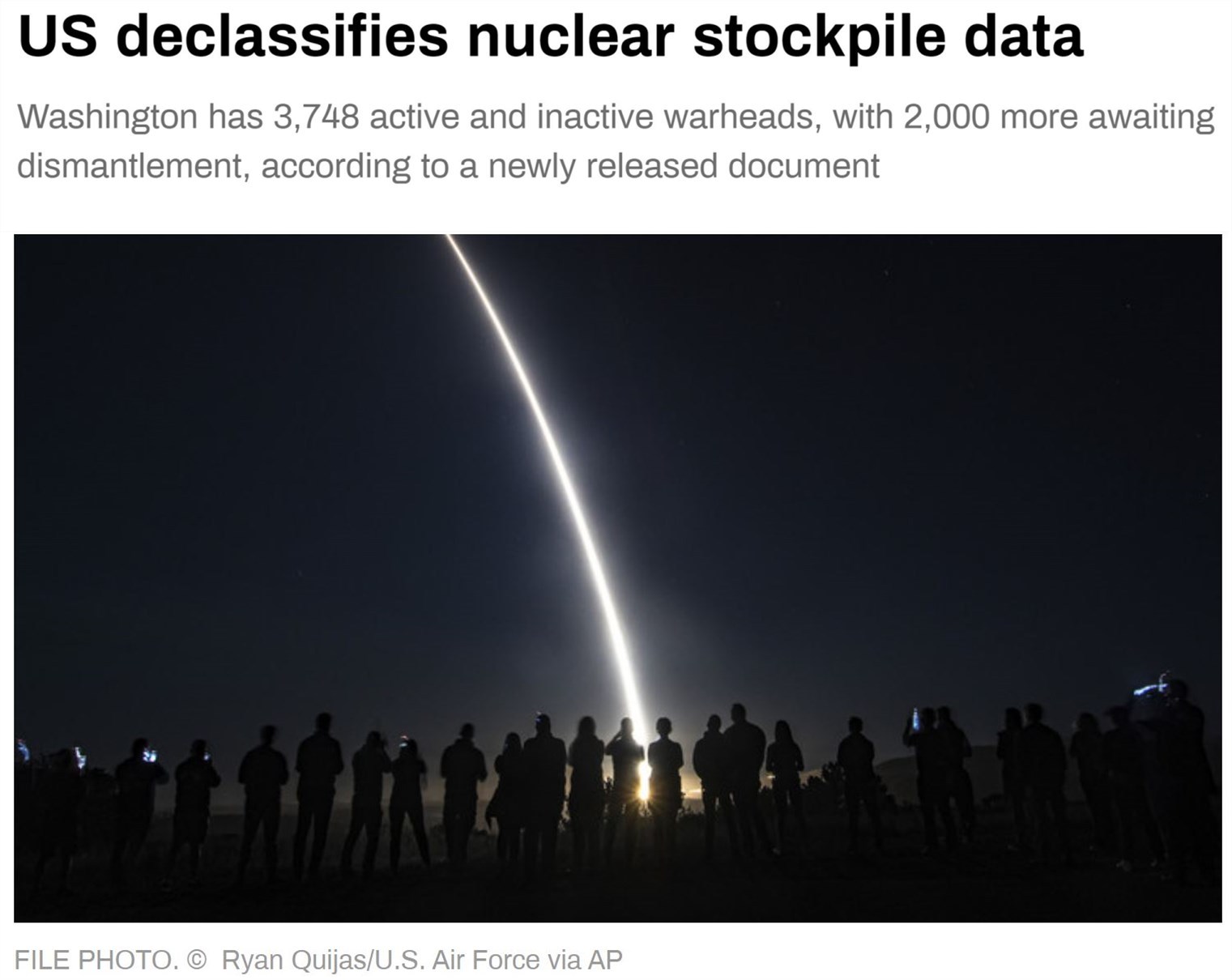 美國(guó)能源部下屬的國(guó)家核安全管理局近日表示,截至2023年9月,美國(guó)核武庫(kù)共有3748枚核彈頭。從1994財(cái)年到2023財(cái)年,美國(guó)銷毀了超過1.2萬(wàn)枚核彈頭。另有2000枚核彈頭已經(jīng)淘汰并等待處置。