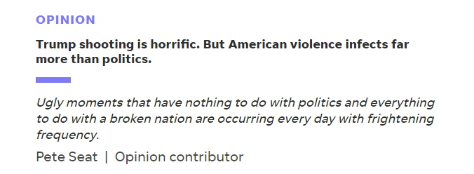 美國(guó)前白宮發(fā)言人、政治評(píng)論員皮特·西特(Pete Seat)日前在《今日美國(guó)報(bào)》(USA Today)網(wǎng)站刊文稱(chēng),特朗普在賓夕法尼亞州競(jìng)選集會(huì)上遭“未遂刺殺”之后,盡管美國(guó)的政界人士、評(píng)論家還有普通民眾都在說(shuō)這起事件是美國(guó)“破碎政治的一個(gè)跡象”,但這其實(shí)是“一個(gè)支離破碎的國(guó)家所體現(xiàn)出來(lái)的癥狀”。