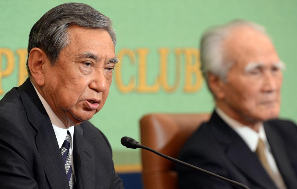 2015年6月9日,在日本東京,日本前內(nèi)閣官房長(zhǎng)官河野洋平(左)發(fā)表講話。當(dāng)日,河野洋平和前首相村山富市在日本記者俱樂(lè)部舉行對(duì)談,重申承認(rèn)殖民侵略歷史事實(shí)、堅(jiān)持和平憲法對(duì)日本的重要意義。新華社記者馬平攝
